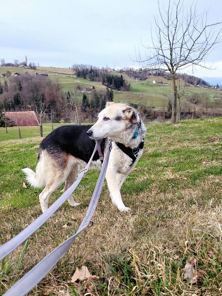 Rya ist klar eine Hündin mit schlimmer Vergangenheit und es bricht einem das Herz sie so ängstlich zu sehen. Aber sie hat mich auch überrascht und umgehauen. War das Gestell mal montiert und die Leine dran, ist sie tapfer mitgelaufen.